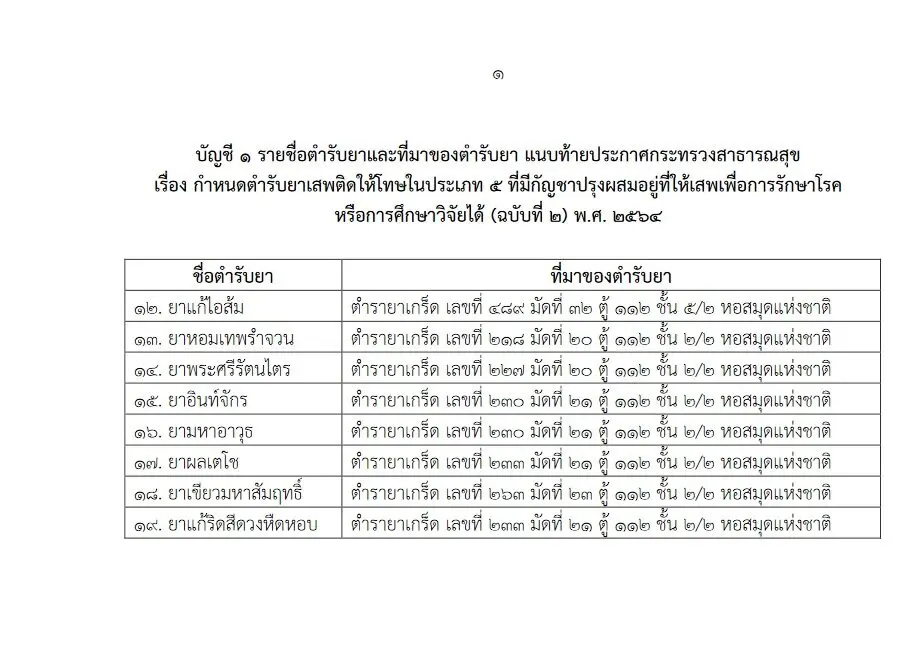 ข้อ ๒ ให้เพิ่มเติมตำรับยาแผนไทยที่มีกัญชาปรุงผสมอยู่ ในตำราการแพทย์แผนไทย โดยคำแนะนำของกรมการแพทย์แผนไทยและการแพทย์ทางเลือกและสภาการแพทย์แผนไทย ที่ให้เสพ เพื่อการรักษาโรคหรือการศึกษาวิจัยได้ ตามบัญชี ๑ ที่แนบท้ายประกาศฉบับนี้ เป็นลำดับที่ ๑๒ ถึงลำดับที่ ๑๙ ในบัญชี ๑ ท้ายประกาศกระทรวงสาธารณสุข เรื่อง กำหนดตำรับยาเสพติดให้โทษ ในประเภท ๕ ที่มีกัญชาปรุงผสมอยู่ที่ให้เสพเพื่อการรักษาโรคหรือการศึกษาวิจัยได้ พ.ศ. ๒๕๖๔ ลงวันที่ ๔ กุมภาพันธ์ พ.ศ. ๒๕๖๔