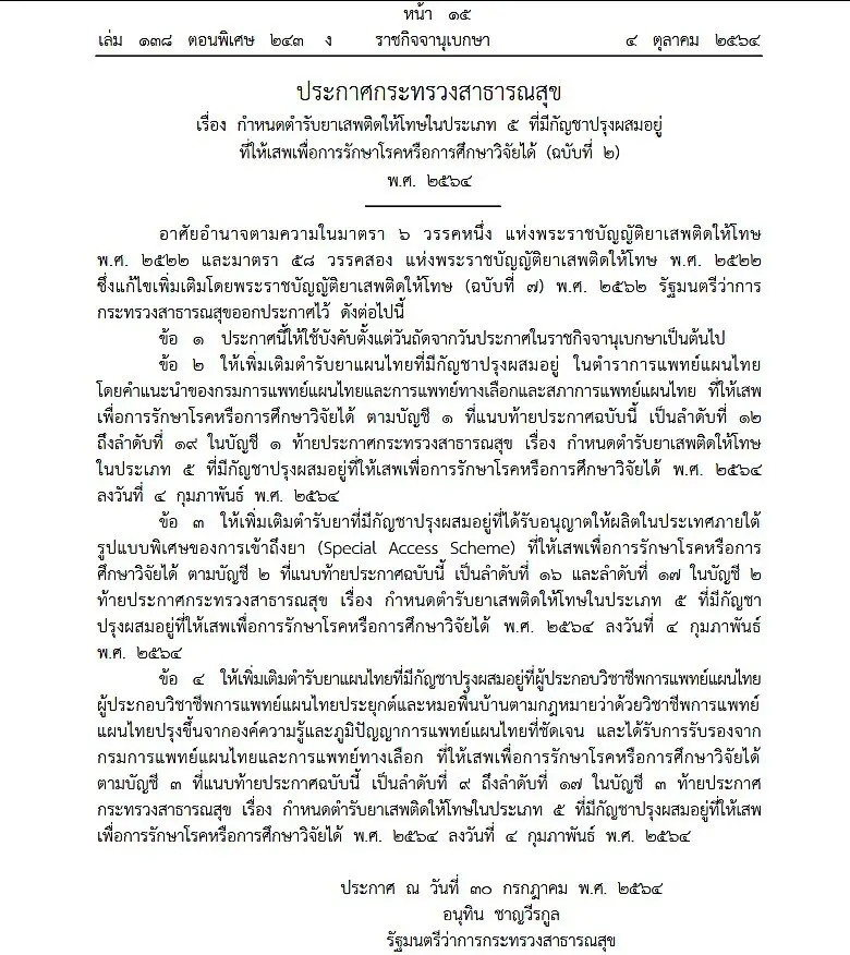 ข้อ ๔ ให้เพิ่มเติมตำรับยาแผนไทยที่มีกัญชาปรุงผสมอยู่ที่ผู้ประกอบวิชาชีพการแพทย์แผนไทย ผู้ประกอบวิชาชีพการแพทย์แผนไทยประยุกต์และหมอพื้นบ้านตามกฎหมายว่าด้วยวิชาชีพการแพทย์ แผนไทยปรุงขึ้นจากองค์ความรู้และภูมิปัญญาการแพทย์แผนไทยที่ชัดเจน และได้รับการรับรองจาก กรมการแพทย์แผนไทยและการแพทย์ทางเลือก ที่ให้เสพเพื่อการรักษาโรคหรือการศึกษาวิจัยได้ ตามบัญชี ๓ ที่แนบท้ายประกาศฉบับนี้ เป็นลำดับที่ ๙ ถึงลำดับที่ ๑๗ ในบัญชี ๓ ท้ายประกาศ กระทรวงสาธารณสุข เรื่อง กำหนดตำรับยาเสพติดให้โทษในประเภท ๕ ที่มีกัญชาปรุงผสมอยู่ที่ให้เสพ เพื่อการรักษาโรคหรือการศึกษาวิจัยได้ พ.ศ. ๒๕๖๔ ลงวันที่ ๔ กุมภาพันธ์ พ.ศ. ๒๕๖๔