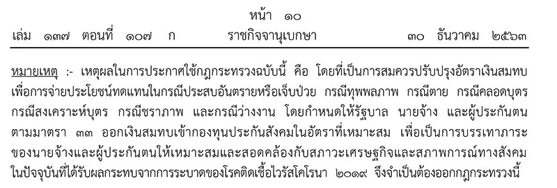 โดยกำหนดให้รัฐบาล นายจ้าง และผู้ประกันตน ตามมาตรา 33 ออกเงินสมทบเข้ากองทุนประกันสังคมในอัตราที่เหมาะสม เพื่อเป็นการบรรเทาภาระของนายจ้างและผู้ประกันตนให้เหมาะสมและสอดคล้องกับสภาวะเศรษฐกิจและสภาพการณ์ทางสังคมในปัจจุบันที่ได้รับผลกระทบจากการระบาดของโรคติดเชื้อไวรัสโคโรนา 2019 จึงจำเป็นต้องออกกฎกระทรวงนี้