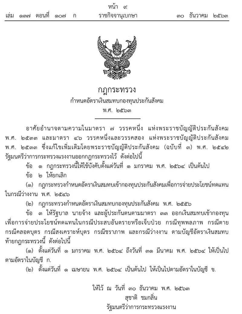 เมื่อวันที่ 5 ม.ค. เว็บไซต์ ราชกิจจานุเบกษา ได้เผยแพร่ กฎกระทรวง เรื่องการกำหนดอัตราเงินสมทบกองทุนประกันสังคม พ.ศ.2563 ซึ่งสำหรับเหตุผลในการประกาศใช้กฎกระทรวงฉบับนี้ โดยที่เป็นการสมควรปรับปรุงอัตราเงินสมทบ เพื่อการจ่ายประโยชน์ทดแทนในกรณีประสบอันตรายหรือเจ็บป่วย กรณีทุพพลภาพ กรณีตาย กรณีคลอดบุตร กรณีสงเคราะห์บุตร กรณีชราภาพ และกรณีว่างงาน