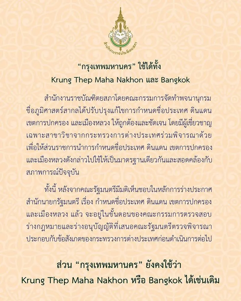 ทั้งนี้ สาระสำคัญของร่างประกาศ ยกเลิกประกาศสำนักนายกรัฐมนตรี เรื่อง กำหนดชื่อประเทศ ดินแดนเขตการปกครอง และเมืองหลวง ลงวันที่ 9 พ.ย. 2544 และให้ใช้ประกาศสำนักงานราชบัณฑิตยสภา เรื่อง กำหนดชื่อประเทศ ดินแดน เขตการปกครอง และเมืองหลวง ลงวันที่ 1 กันยายน พ.ศ. 2564 รายละเอียดดังนี้ ปรับปรุงแก้ไขการกำหนดชื่อประเทศ ดินแดน เขตการปกครอง และเมืองหลวง เช่น เมืองหลวงของประเทศไทย ให้แก้ไขจาก Bangkok เป็น Krung Thep Maha Nakhon เป็นต้น.