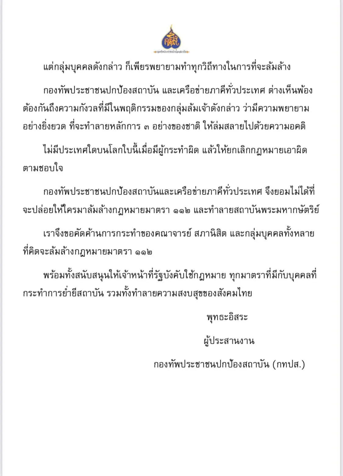 กองทัพประชาชนปกป้องสถาบันและเครือข่ายภาคีทั่วประเทศ จึงยอมไม่ได้ที่จะปล่อยให้ใครมาล้มล้างกฎหมายมาตรา ๑๑๒ และทำลายสถาบันพระมหากษัตริย์