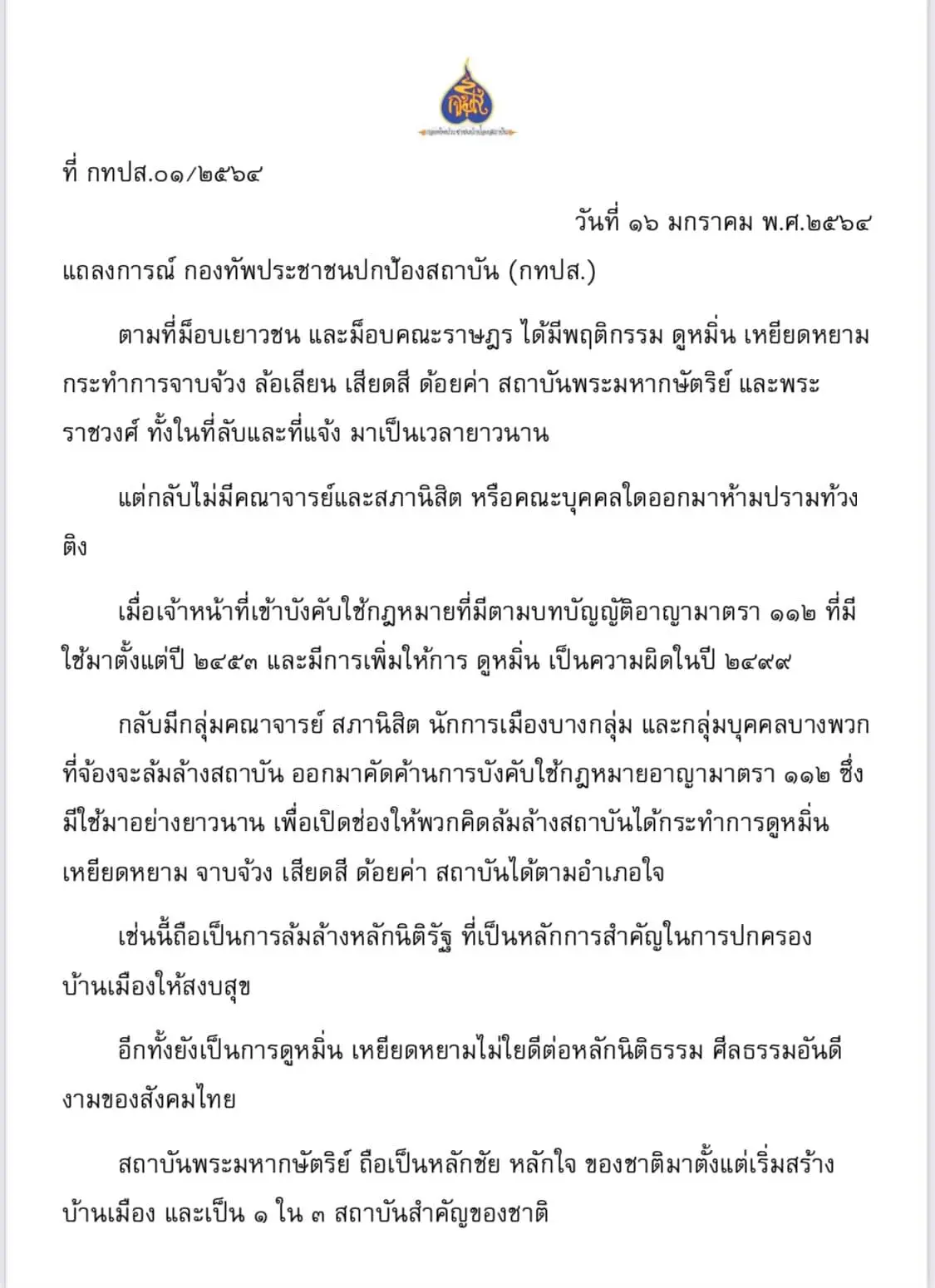 ตามที่ม็อบเยาวชน และม็อบคณะราษฎร ได้มีพฤติกรรม ดูหมิ่น เหยียดหยาม กระทำการจาบจ้วง ล้อเลียน เสียดสี ด้อยค่า สถาบันพระมหากษัตริย์ และพระราชวงศ์ ทั้งในที่ลับและที่แจ้ง มาเป็นเวลายาวนาน