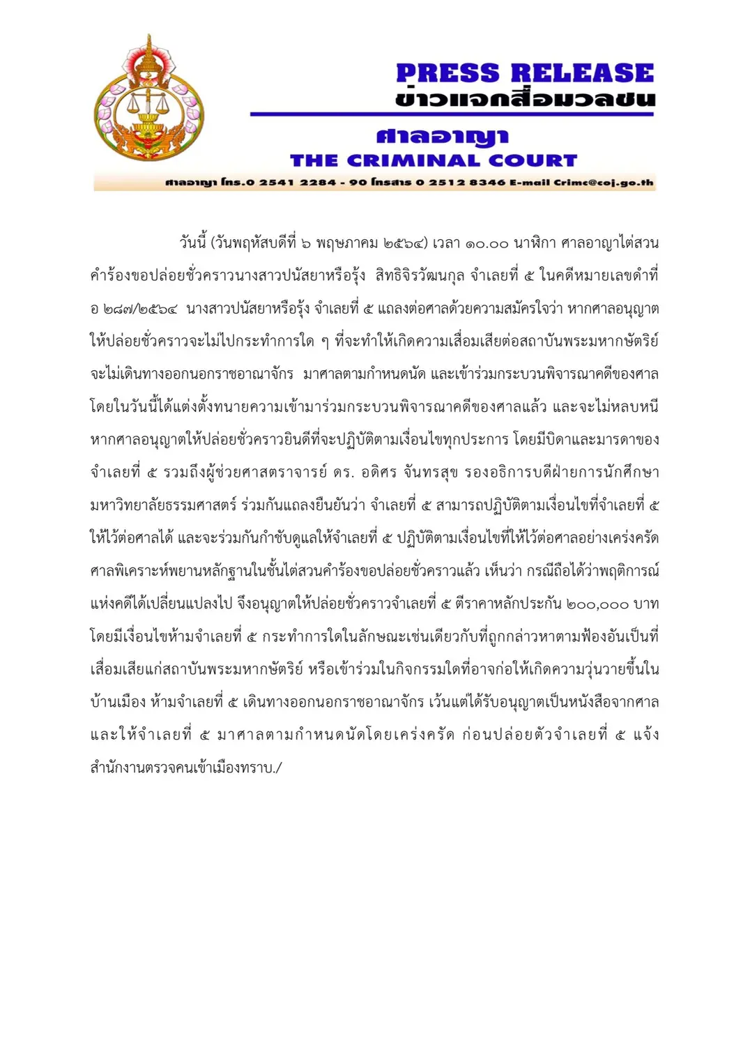 ทั้งนี้ ศาลพิเคราะห์จากทางไต่สวนพฤติการณ์แห่งคดีเปลี่ยนแปลงไป จึงอนุญาตให้ประกันตัว น.ส.ปนัสยา ด้วยหลักทรัพย์ 200,000 บาท พร้อมกำหนดเงื่อนไขห้ามทำการเสื่อมเสียต่อสถาบันพระมหากษัตริย์, ห้ามร่วมกิจกรรมที่อาจก่อความวุ่นวายในบ้านเมือง, ห้ามเดินทางออกนอกราชอาณาจักร เว้นแต่ได้รับอนุญาตจากศาล และให้มาศาลตามนัด
