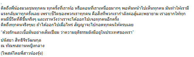 คิดถึงพี่น้องมวลชนทุกคน ทุกครั้งที่เราท้อ หรือตอนที่เราเหนื่อยมากๆ พอหันหน้าไปเห็นทุกคน มันทำให้เรามีแรงกลับมาทุกครั้งเลย เพราะชีวิตของพวกเราทุกคน คือสิ่งที่พวกเรากำลังต่อสู้และพยายาม เราอยากให้ทุกคนมีชีวิตที่ดีขึ้นจริงๆ และเราหวังว่าเราจะได้ออกไปเจอทุกคนอีกครั้ง