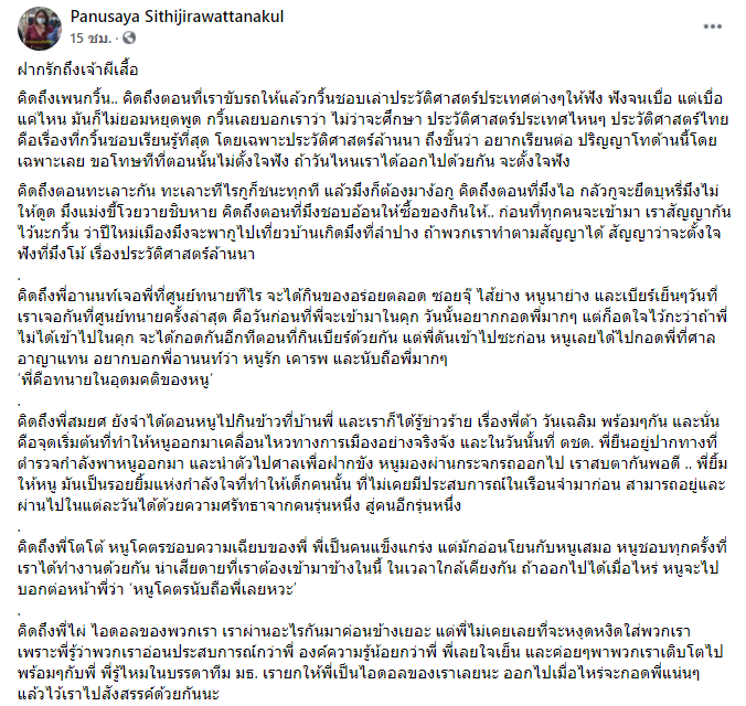 คิดถึงพี่อานนท์เจอพี่ที่ศูนย์ทนายทีไร จะได้กินของอร่อยตลอด ซอยจุ๊ ไส้ย่าง หนูนาย่าง และเบียร์เย็นๆวันที่เราเจอกันที่ศูนย์ทนายครั้งล่าสุด คือวันก่อนที่พี่จะเข้ามาในคุก วันนั้นอยากกอดพี่มากๆ แต่ก็อดใจไว้กะว่าถ้าพี่ไม่ได้เข้าไปในคุก จะได้กอดกันอีกทีตอนที่กินเบียร์ด้วยกัน แต่พี่ดันเข้าไปซะก่อน หนูเลยได้ไปกอดพี่ที่ศาลอาญาแทน อยากบอกพี่อานนท์ว่า หนูรัก เคารพ และนับถือพี่มากๆ