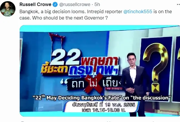 รัสเซล โครว์ ดารานักแสดงระดับโลก ร่วมส่งคำถามถึงผู้สมัครก่อนเลือกตั้งผู้ว่าฯกทม. ผ่านรายการช่องทีวีประเทศไทย