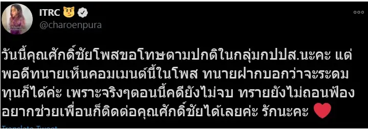 “วันนี้คุณศักดิ์ชัยโพสต์ขอโทษตามปกติในกลุ่มกปปส.นะคะ แต่พอดีทนายเห็นคอมเมนต์นี้ในโพสต์ ทนายฝากบอกว่าจะระดมทุนก็ได้ค่ะ เพราะจริงๆตอนนี้คดียังไม่จบ ทรายยังไม่ถอนฟ้อง อยากช่วยเพื่อนก็ติดต่อคุณศักดิ์ชัยได้เลยค่ะ รักนะคะ”