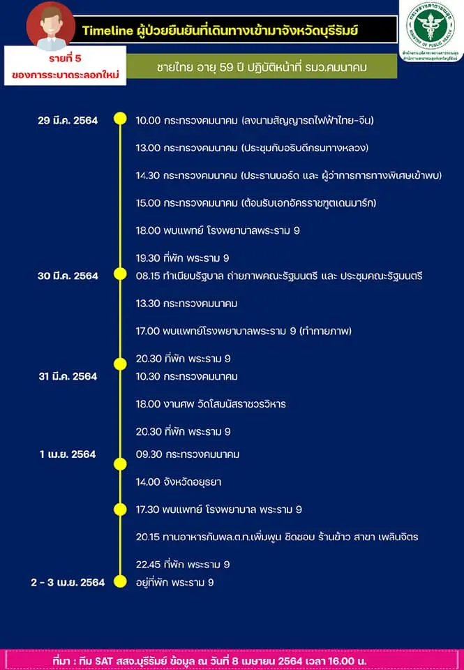 ล่าสุด สำนักงานสาธารณสุขจังหวัดบุรีรัมย์ ได้เปิดเผยผลการสอบสวนไทม์ไลน์ของนายศักดิ์สยามอย่างเป็นทางการผ่านทางเฟซบุ๊ก สสจ. บุรีรัมย์ พร้อมกับยืนยันว่า แหล่งติดเชื้อคือการติดจากผู้ป่วยยืนยันที่ปฏิบัติงานในสำนักงาน รมว.คมนาคม โดยไทม์ไลน์ของนายศักดิ์สยามมีดังนี้