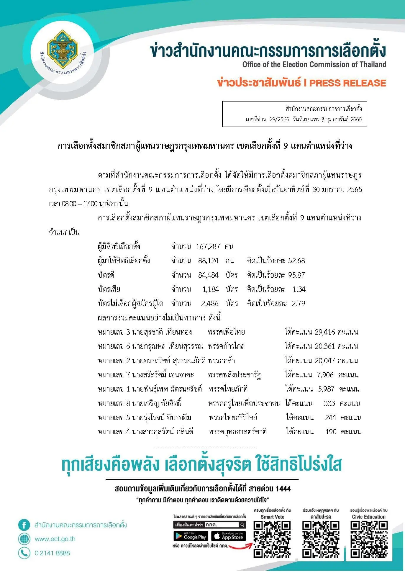 เลือกตั้งซ่อมเขตหลักสี่ —- เมื่อวันที่ 3 ก.พ. 2565 สำนักงานคณะกรรมการการเลือกตั้ง (กกต.) เผยแพร่ผลการเลือกตั้งซ่อม ส.ส.กทม. เขต 9 (หลักสี่-จตุจักร) แทนตำแหน่งที่ว่างลง ภายหลังจัดการเลือกตั้งเมื่อวันที่ 30 ม.ค. 2565 ที่ผ่านมา โดยพบว่า มีผู้มีสิทธิเลือกตั้ง จำนวน 167,287 คน ผู้มาใช้สิทธิ 88,124 คน (ร้อยละ 52.68) บัตรดี 84,484 ใบ (ร้อยละ 95.87) บัตรเสีย 1,184 ใบ (ร้อยละ 1.34) บัตรไม่เลือกผู้สมัครผู้ใด 2,486 ใบ (ร้อยละ 2.79)