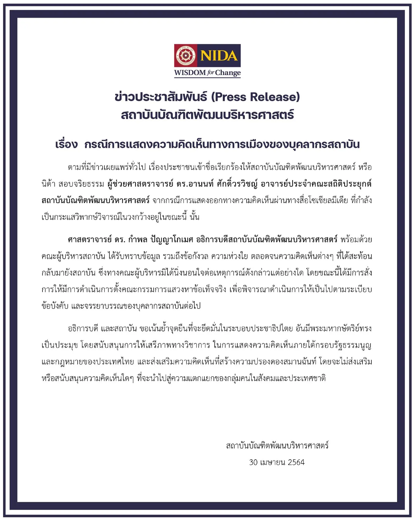 กรณีการแสดงความคิดเห็นทางการเมืองของบุคลากรสถาบัน ตามที่มีข่าวเผยแพร่ทั่วไป เรื่องประชาชนเข้าชื่อเรียกร้องให้สถาบันบัณฑิตพัฒนบริหารศาสตร์ หรือ นิด้า สอบจริยธรรม ผู้ช่วยศาสตราจารย์ ดร.อานนท์ ศักดิ์วรวิชญ์ อาจารย์ประจำคณะสถิติประยุกต์ สถาบันบัณฑิตพัฒนบริหารศาสตร์ จากกรณีการแสดงออกทางความคิดเห็นผ่านทางสื่อโซเชียลมีเดีย ที่กำลังเป็นกระแสวิพากษ์วิจารณ์ในวงกว้างอยู่ในขณะนี้ นั้น