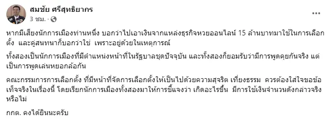“หากมีเสียงนักการเมืองท่านหนึ่ง บอกว่าไปเอาเงินจากแหล่งธุรกิจหวยออนไลน์ 15 ล้านบาทมาใช้ในการเลือกตั้ง และคู่สนทนาก็บอกว่าใช่ เพราะอยู่ด้วยในเหตุการณ์
