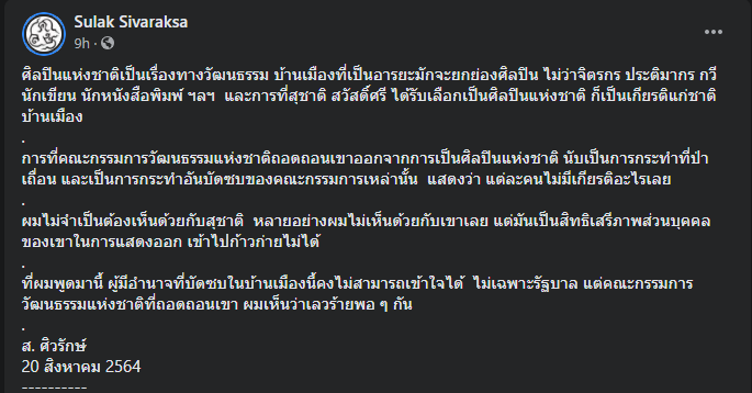 ล่าสุด นายสุลักษณ์ ศิวรักษ์ หรือ ส.ศิวรักษ์ นักเขียนและนักปรัชญาชื่อดัง ได้โพสต์เฟซบุ๊กเมื่อวานนี้(20 ส.ค.2564) ถึงกรณีการปลดนายสุชาติจากการเป็นศิลปินแห่งชาติ โดยระบุว่า