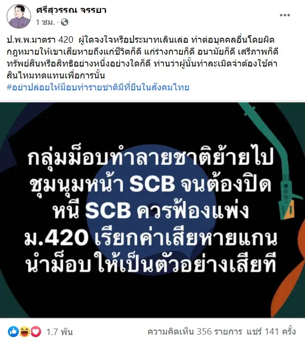 ม็อบ25พฤศจิกา นายศรีสุวรรณ จรรยา เลขาธิการสมาคมองค์การพิทักษ์รัฐธรรมนูญไทย โพสต์ข้อความผ่านเฟซบุ๊ก ระบุว่า ป.พ.พ.มาตรา 420 ผู้ใดจงใจหรือประมาทเลินเล่อ ทำต่อบุคคลอื่นโดยผิดกฎหมายให้เขาเสียหายถึงแก่ชีวิตก็ดี แก่ร่างกายก็ดี อนามัยก็ดี เสรีภาพก็ดี ทรัพย์สินหรือสิทธิอย่างหนึ่งอย่างใดก็ดี ท่านว่าผู้นั้นทำละเมิดจำต้องใช้ค่าสินไหมทดแทนเพื่อการนั้น