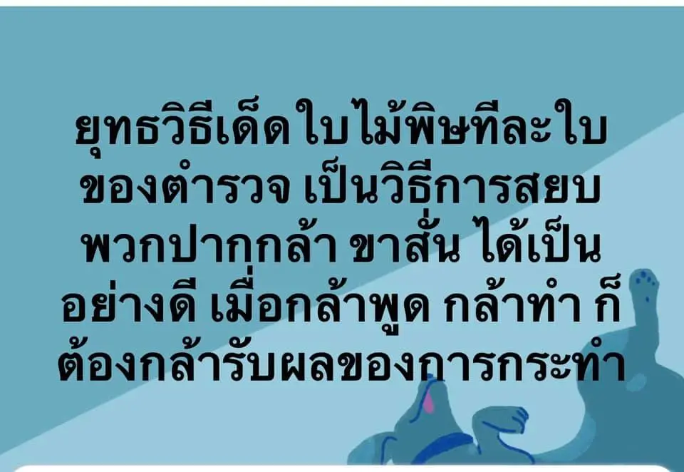 “ยุทธวิธีเด็ดใบไม้พิษทีละใบของตำรวจ เป็นวิธีการสยบพวกปากกล้า ขาสั่น ได้เป็นอย่างดี เมื่อกล้าพูดกล้าทำก็ต้องกล้ารับผลของการกระทำ”