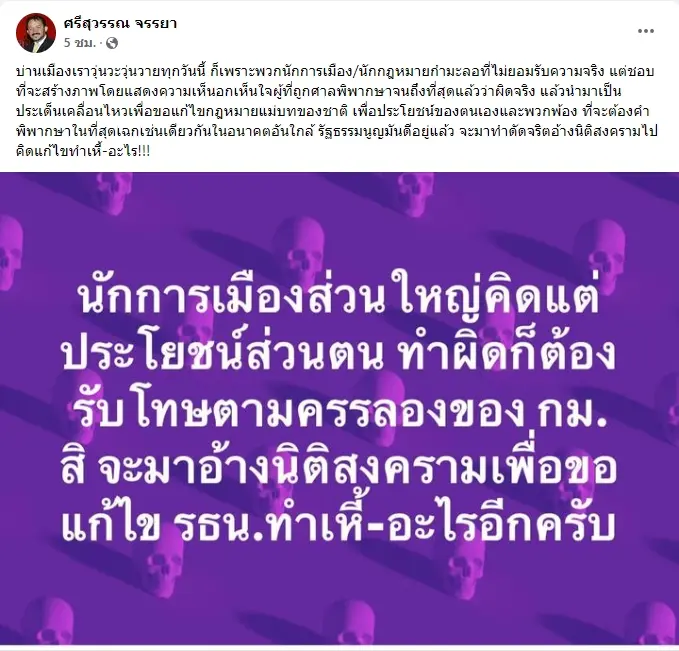 ศรีสุวรรณ จรรยา ฟาดนักการเมือง นักกฎหมายกำมะลอ สาเหตุทำบ้านเมืองวุ่นวาย เพราะเห็นแก่ประโยชน์ตนเอง และพวกพ้อง