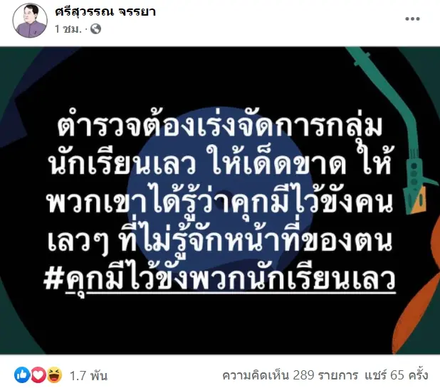 ม็อบ22พฤศจิกา นายศรีสุวรรณ จรรยา เลขาธิการสมาคมองค์การพิทักษ์รัฐธรรมนูญไทย โพสต์ภาพระบุข้อความลงในเฟซบุ๊กว่า ตำรวจต้องเร่งจัดการกลุ่มนักเรียนเลวให้เด็ดขาด ให้พวกเขาได้รู้ว่าคุกมีไว้ขังคนเลว ๆ ที่ไม่รู้จักหน้าที่ของตน #คุกไว้ขังพวกนักเรียนเลว