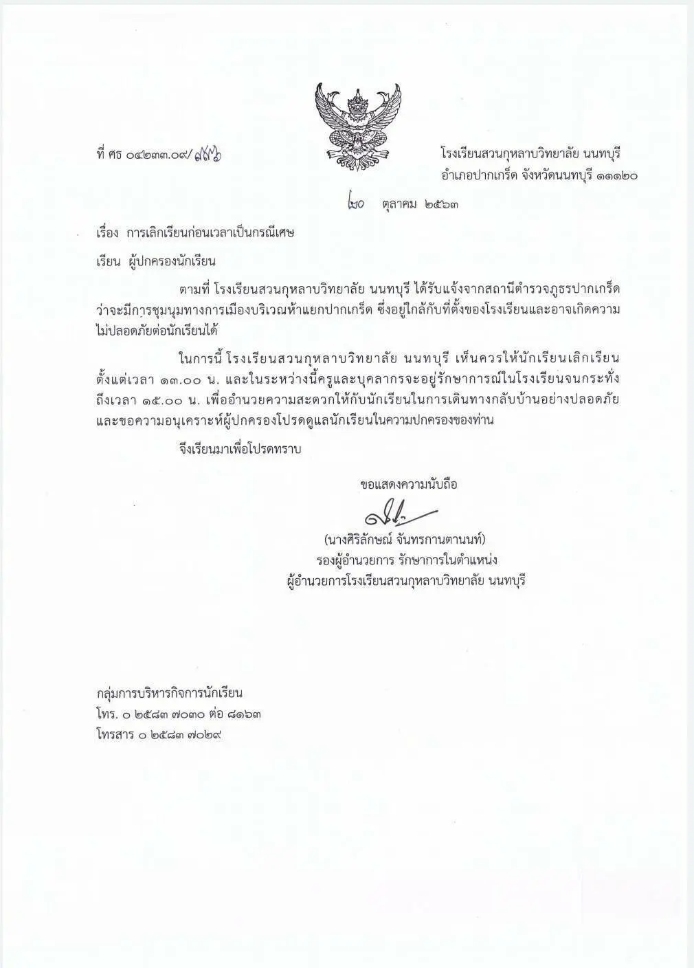 ตามที่โรงเรียนสวนกุหลาบวิทยาลัย นนทบุรี ได้รับแจ้งจากสถานีตำรวจภูธรปากเกร็ดว่าจะมีการชุมนุมทางการเมือง บริเวณห้าแยกปากเกร็ด ซึ่งอยู่ใกล้กับโรงเรียน ทางโรงเรียนจึงเห็นสมควรให้ประกาศ เลิกเรียนก่อนเวลาเป็นกรณีพิเศษโดยเห็นควรให้นักเรียนเลิกเรียนตั้งแต่เวลา 13.00 น.