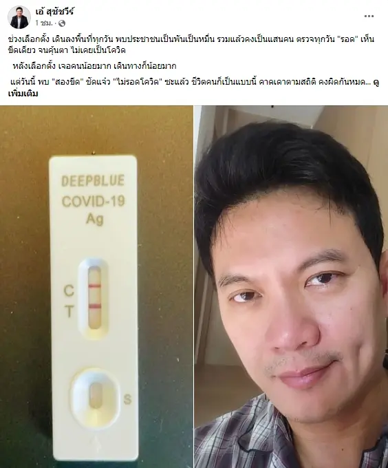 โดยข้อความในเฟซบุ๊ก เอ้ สุชัชวีร์ ระบุว่า “ช่วงเลือกตั้ง เดินลงพื้นที่ทุกวัน พบประชาชนเป็นพันเป็นหมื่น รวมแล้วคงเป็นแสนคน ตรวจทุกวัน “รอด” เห็นขีดเดียว จนคุ้นตา ไม่เคยเป็นโควิด