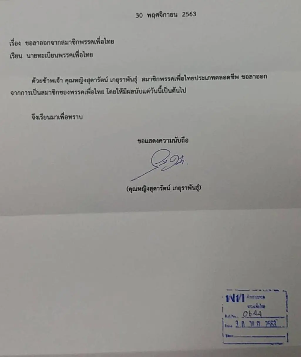 คุณหญิงสุดารัตน์ เกยุราพันธุ์ อดีตประธานคณะกรรมการยุทธศาสตร์พรรคเพื่อไทย พร้อมด้วย นายโภคิน พลกุล นายวัฒนา เมืองสุข คณะกรรมการยุทธศาสตร์ และนายพงศกร อรรณพพร อดีตส.ส.ขอนแก่น พรรคเพื่อไทยได้ยื่นหนังสือลาออกจากการเป็นสมาชิกพรรคแล้ว โดยจะมีผลตั้งแต่วันนี้ (30 พ.ย.) เป็นต้นไป