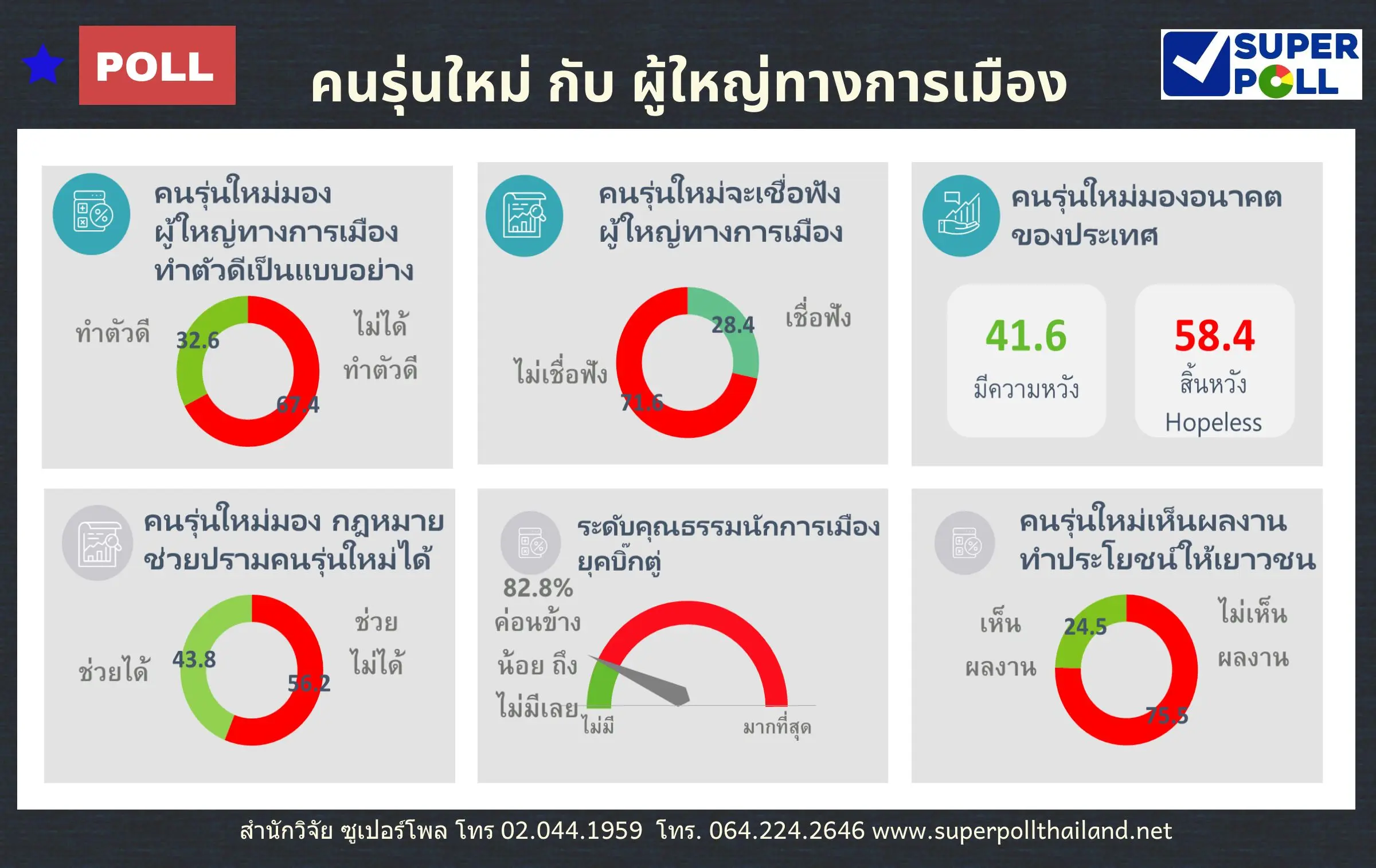 ที่น่าพิจารณาคือ ส่วนใหญ่หรือร้อยละ 79.0 ระบุ คนรุ่นใหม่มองการเมืองปัจจุบันเป็น การเมืองเก่า ในขณะที่ร้อยละ 21.0 ระบุเป็นการเมืองใหม่ นอกจากนี้ ส่วนใหญ่หรือร้อยละ 75.5 ระบุไม่เห็นผลงานของรัฐบาลที่ทำประโยชน์อะไรให้กับเยาวชน ในขณะที่ร้อยละ 24.5 ระบุเห็นผลงาน ที่น่าเป็นห่วงอย่างยิ่งคือ ส่วนใหญ่หรือร้อยละ 58.4 ระบุคนรุ่นใหม่ สิ้นหวังในการมองอนาคตของประเทศ ในขณะที่ร้อยละ 41.6 มีความหวัง