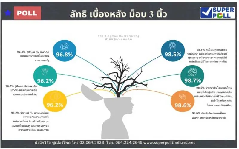 ผอ.ซูเปอร์โพล กล่าวด้วยว่า “กลุ่มราษฎรเกือบทั้งประเทศไม่เอาด้วยกับพวกค้อน เคียวเพราะยังคงสำนึกรู้คุณแผ่นดินกตัญญูต่อองค์พระมหากษัตริย์ทุกพระองค์ที่ให้แผ่นดินไว้ได้อยู่และทำกิน และกลุ่มราษฎรกำลังต้องการคนแบบ พล.อ.เปรม ติณสูลานนท์ ที่เอาตัวเองเข้าแลกยอมเอาปัญหาชาติและกระแสมาลงที่ตัวเองโดยไม่ให้ไปกระทบต่อองค์พระมหากษัตริย์และสถาบันหลักของชาติ ตามหลักของ The King Can Do No Wrong แท้จริง แต่ยุคนี้เวลานี้อาจจะหายาก เพราะผู้มีอำนาจรัฐ (State Power) บางคนมักจะหลบมุมที่ปลอดภัย (Safety Zone) เพื่อความปลอดภัยของตัวเองและพวกพ้องโดยทำตามๆกันแค่ให้เห็นว่าได้ทำมากมาย แต่เมื่อถามว่าที่ทำไปมากมายนั้นทำไปแล้วได้อะไร คำถามนี้ผู้มีอำนาจรัฐคงตอบยาก เพราะถ้าทำได้ผลดีจริงสถาบันหลักของชาติคงจะไม่แกว่งตัวมากขนาดนี้ ดังนั้นราษฎรสามัญชนทุกคนในชาติที่ไม่ได้มีอำนาจรัฐในมือ (Non-State Power) ต้องออกตัวแรงกันเองด้วยจิตอาสา เสี่ยงต่อความไม่ปลอดภัยและสูญเสียมาแสดงตนช่วยกันตามแบบอย่างของ พล.อ.เปรม ติณสูลานนท์ สำนึกรู้คุณอย่างแท้จริงต่อแผ่นดินและองค์พระมหากษัตริย์ทุกพระองค์สืบไป”