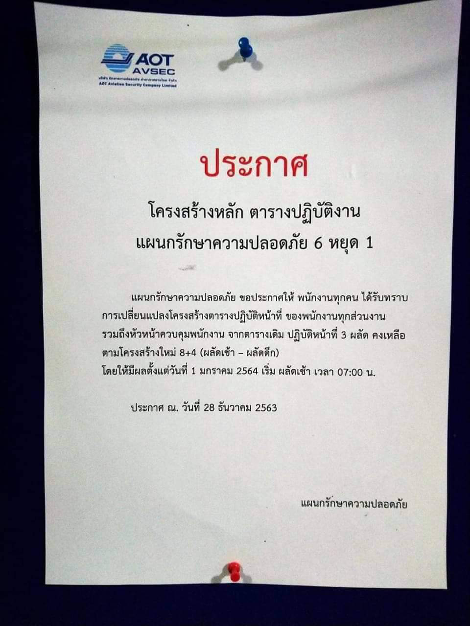 โดยก่อนหน้านี้ บริษัท ท่าอากาศยานไทย จำกัด (มหาชน) (AOT) ได้ออกประกาศโครงสร้างหลักตรารางปฏิบัติงานแผนกรักษาความปลอดภัย โดยประกาศให้พนักงานทุกคน ได้รับทราบการเปลี่ยนแปลงโครงสร้างตารางปฏิบัติหน้าที่ของพนักงานทุกส่วนงาน รวมถึงหัวหน้าควบคุมพนักงาน จากตารางเดิมปฏิบัติหน้าที่ 3 ผลัด คงเหลือตามดครงสร้างใหม่ 8+4 (ผลัดเช้า – ผลัดดึก) โดยให้มีผลตั้งแต่วันที่ 1 มกราคม 2564 เริ่ม ผลัดเช้าเวลา 7.00 น.