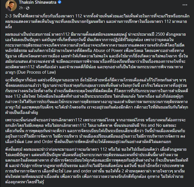 เมื่อวันที่ 2 พ.ย.2564 ทักษิณ ชินวัตร อดีตนายกรัฐมนตรีได้โพสต์เฟซบุ๊ก แสดงความคิดเห็นประเด็นการแก้ไขม.112 หลังมีบรรดาพรรคการเมืองหลายพรรค ซึ่งออกมาประกาศจุดยืนทั้งให้ยกเลิกและแก้ไขม.122 โดยอดีตนายกรัฐมนตรีทักษิณได้แสดงความคิดเห็นในกรณีดังกล่าวดังนี้