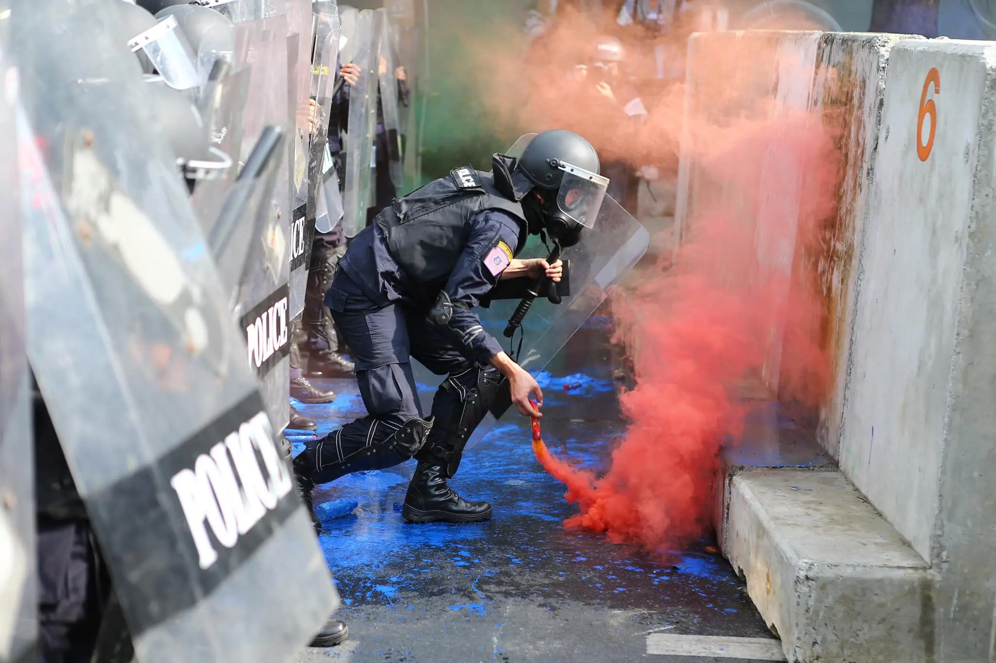 แก๊สน้ำตา — สถานการณ์การเผชิญหน้ากันระหว่างกลุ่มผู้ประท้วงราษฎรและตำรวจบริเวณอาคารรัฐสภา เกียกกายยังคงเป็นไปอย่างตึงเครียด หลัวจากที่ตำรวจเริ่มฉีดน้ำใส่ไล่กลุ่มผู้ประท้วงไม่ให้เข้ามาในบริเวณหน้ารัฐสภา หลังการ์ดของกลุ่มราษฎรได้ใช้คีนตัดลวดนาม และพยายามยกแท่นแบร์ริเออร์ออกมา