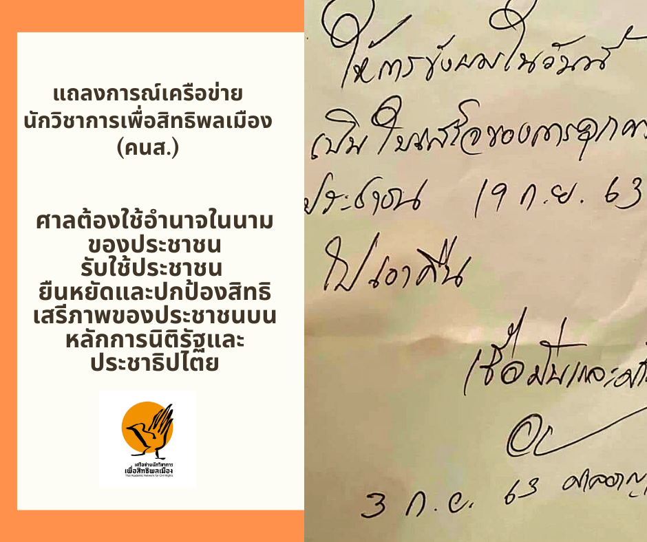 เครือข่ายนักวิชาการเพื่อสิทธิพลเมือง (คนส.) ออกแถลงการณ์เรื่อง ศาลต้องใช้อำนาจในนามของประชาชน รับใช้ประชาชน ยืนหยัดและปกป้องสิทธิเสรีภาพของประชาชนบนหลักการนิติรัฐและประชาธิปไตย