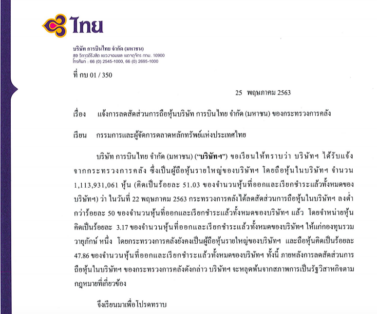 โดยระบุว่าบริษัท การบินไทย ได้รับแจ้งจากกระทรวงการคลัง ซึ่งเป็นผู้ถือหุ้นรายใหญ่ของบริษัทฯ จำนวน 1,113,931,061 หุ้น หรือ ร้อยละ 50 ของจำนวนหุ้นที่ออกและชำระแล้วทั้งหมดของบริษัทฯ ว่า ในวันที่ 22 พ.ค. 2563 กระทรวงการคลังได้ลดสัดส่วนการถือหุ้นในบริษัทฯ ลงต่ำกว่าร้อยละ 50 โดยจำหน่ายหุ้นร้อยละ 3.17 ให้แก่กองทุนรวม วายุภักษ์ หนึ่ง ส่งผลให้กระทรวงการคลังยังคงเป็นผู้ถือหุ้นรายใหญ่ของบริษัทฯ และถือหุ้นคิดเป็นร้อยละ 47.86