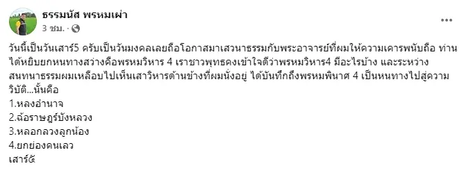 ร.อ.ธรรมนัส พรหมเผ่า ส.ส.พะเยา พรรคเศรษฐกิจไทย โพสต์ข้อความผ่านเฟซบุ๊ก ธรรมนัส พรหมเผ่า เมื่อวันที่ 5 มีนาคม 2565 แฝงแง่คิดธรรมะ หลังจากได้เสวนาธรรมกับพระที่เคารพนับถือ โดยระบุข้อความว่า