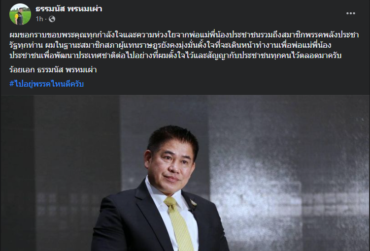 อย่างไรก็ดี ล่าสุด เมื่อวานนี้ ร.อ.ธรรมนัสได้โพสต์ข้อความผ่านทางเฟซบุ๊กส่วนตัว หลังถูกขับออกจากพรรคพลังประชารัฐ โดยบอกว่า