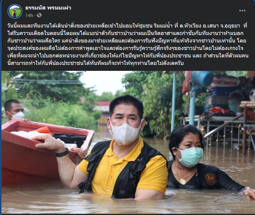 วันนี้ผมและทีมงานได้เดินนำสิ่งของช่วยเหลือเข้าไปมอบให้ชุมชน ริมแม่น้ำ ที่ ต.หัวเวียง อ.เสนา จ.อยุธยา ที่ได้รับความเดือดในตอนนี้โดยผมได้แนะนำตัวกับชาวบ้านว่าผมเป็นจิตอาสาและกำชับกับทีมงานว่าห้ามบอกกับชาวบ้านว่าผมคือใคร แค่นำสิ่งของมาช่วยเหลือและต้องการรับฟังปัญหาที่แท้จริงจากชาวบ้านเท่านั้น