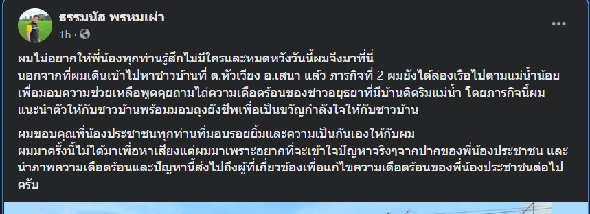 ทั้งนี้ ภายหลังเสร็จสิ้นภารกิจลงพื้นที่ช่วยผู้ประสบภัยดังกล่าว เมื่อวันที่ 5 ต.ค. 2564 ร.อ ธรรมนัสได้โพสต์เฟซบุ๊ก ส่วนตัวชี้แจงกรณีการลงพื้นที่น้ำท่วมในจังหวัดพระนครศรีอยุธยา ดังนี้