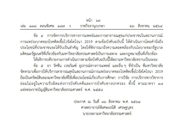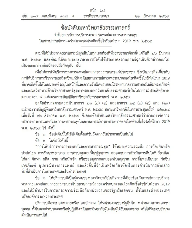 เมื่อวันที่ 26 ส.ค. 2564 เว็บไซต์ ราชกิจจานุเบกษา เผยแพร่ ข้อบังคับ มหาวิทยาลัยธรรมศาสตร์ ว่าด้วยการจัดการบริการทางการแพทย์และการสาธารณสุขในสถานการณ์การแพร่ระบาดของโรคติดเชื้อไวรัสโคโรนา 2019 พ.ศ. 2564 ความว่า ตามที่ได้มีประกาศสถานการณ์ฉุกเฉินในทุกเขตท้องที่ทั่วราชอาณาจักรตั้งแต่วันที่ 26 มีนาคม พ.ศ. 2563 และต่อมาได้ขยายระยะเวลาการบังคับใช้ประกาศสถานการณ์ฉุกเฉินดังกล่าวออกไปเป็นระยะอย่างต่อเนื่องจนถึงปัจจุบันนั้น