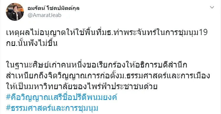 “ในฐานะศิษย์เก่าคนหนึ่งขอเรียกร้องให้อธิการบดีสำนึกสำเหนียก ถึงจิตวิญญาณการก่อตั้งม.ธรรมศาสตร์ และการเมืองให้เป็นมหาวิทยาลัยของไพร่ฟ้าประชาชนด้วย #คือวิญญาณเสรีชื่อปรีดีพนมยงค์ #ธรรมศาสตร์และการชุมนุม”