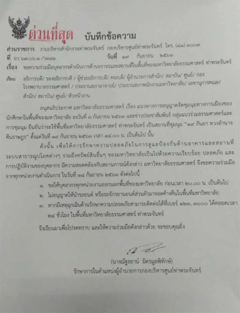 โดยหนังสือดังกล่าว ได้ส่งถึง อธิการบดี รองอธิการบดี ผู้ช่วยอธิการบดี คณบดี ผู้อำนวยการสำนัก สถาบัน ศูนย์ กองโรงพยาบาลธรรมศาสตร์ ประธานสภาอาจารย์ ประธานสภาพนักงานมหาวิทยาลัย ฯลฯ เรื่องแนวทางการอนุญาตจัดชุมนุมทางการศึกษาในพื้นที่ของมหาวิทยาลัย ลงวันที่ 3 กันยายน 2563 และข่าวประชาสัมพันธ์ กลุ่มแนวร่วมธรรมศาสตร์และการชุมนุม ยืนยันว่าจะใช้พื้นที่มหาวิทยาลัยธรรมศาสตร์ ท่าพระจันทร์ เป็นสถานที่ชุมนุม “19 กันยา ทวงอำนาจคืนราษฎร”ตั้งแต่วันที่ 19 กันยายน 2563 เวลา 14.00 น เป็นต้นไปนั้น