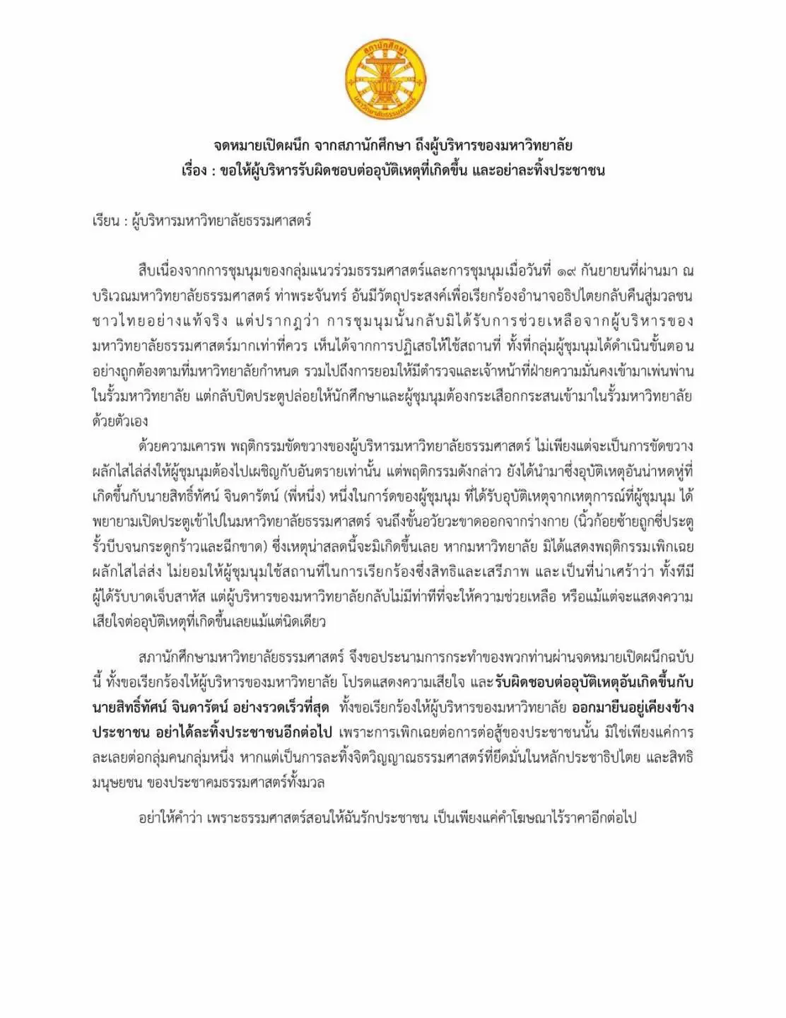 ธรรมศาสตร์ – วันที่ 28 กันยายน 63 รุ้ง ปนัสยา สิทธิจิรวัฒนกุล แนวร่วมธรรมศาสตร์และการชุมนุม ได้โพสต์จดหมายเปิดผนึกจากสภานักศึกษา ถึงผู้บริหารของมหาวิทยาลัยธรรมศาสต์ ขอให้ผู้บริหารรับผิดชอบต่ออุบัติเหตุที่เกิดขึ้นในการชุมนุมวันที่ 19 กันยา ทวงอำนาจคืนราษฎร ที่จัดขึ้นบริเวณมหาวิทยาลัยธรรมศาสตร์ (ท่าพระจันทร์) โดยมีใจความสำคัญว่า