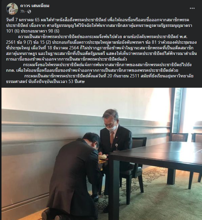 วันที่ 7 มกราคม 65 ผมได้ทำหนังสือถึงพรรคประชาธิปัตย์ เพื่อให้ถอนชื่อหรือลบชื่อออกจากสมาชิกพรรคประชาธิปัตย์ เนื่องจาก ศาลรัฐธรรมนูญได้วินิจฉัยให้พ้นจากสมาชิกสภาผู้แทนราษฎรตามรัฐธรรมนูญมาตรา 101 (6) ประกอบมาตรา 98 (6)