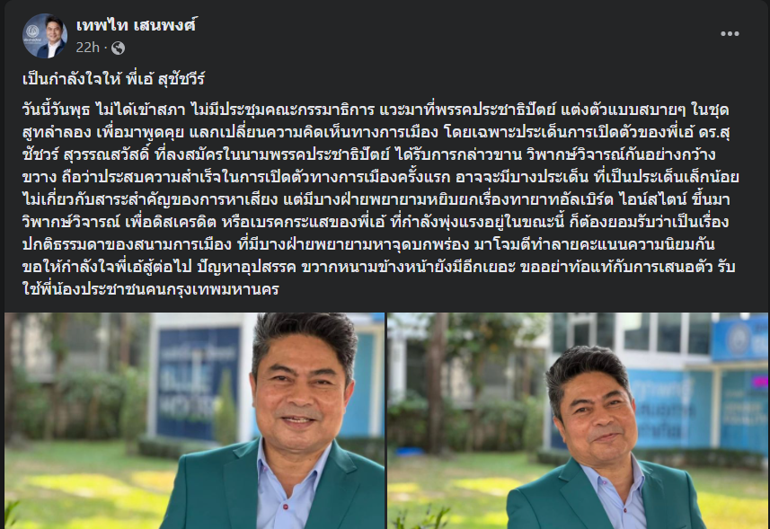 ล่าสุด เมื่อวันที่ 16 ธ.ค. 2564 นายเทพไท เสนพงศ์ อดีตส.ส.นครศรีธรรมราช พรรคประชาธิปัตย์ได้โพสต์เฟซบุ๊กแสดงความคิดเห็นในประเด็นการลงสมัครชิงตำแหน่งผู้ว่าฯกทม.ของดร.สุชัชวร์ว่า