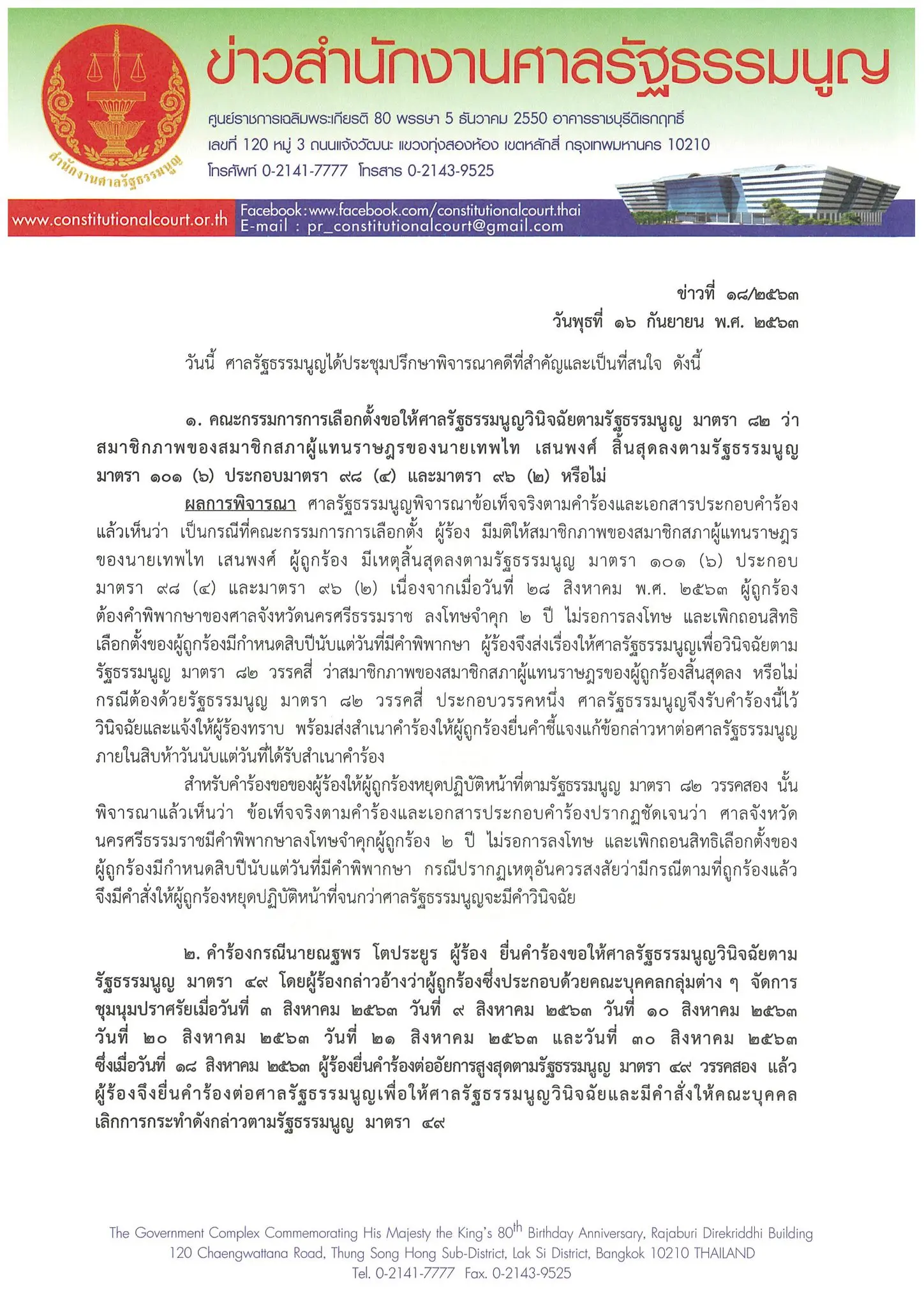 ทั้งนี้ ศาลรัฐธรรมนูญได้ประชุมปรึกษาพิจารณาคดีที่สำคัญ กรณีคณะกรรมการการเลือกตั้งขอให้ศาลรัฐธรรมนูญวินิจฉัยตามรัฐธรรมนูญ มาตรา 82 ว่า สมาชิกภาพของสมาชิกสภาผู้แทนราษฎรของ เทพไท เสนพงศ์ สิ้นสุดลงตามรัฐธรรมนูญ มาตรา 101 (6) ประกอบมาตรา 98 (4) และมาตรา 96 (2) หรือไม่