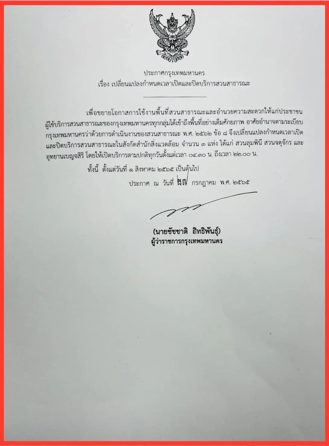 กรุงเทพมหานคร เปลี่ยนแปลงกำหนดเวลาเปิด – ปิดบริการสวนสาธารณะ กทม. ภายหลังจากนาย ชัชชาติ สิทธิพันธุ์ ผู้ว่าฯกทม. ลงนามประกาศกรุงเทพมหานคร