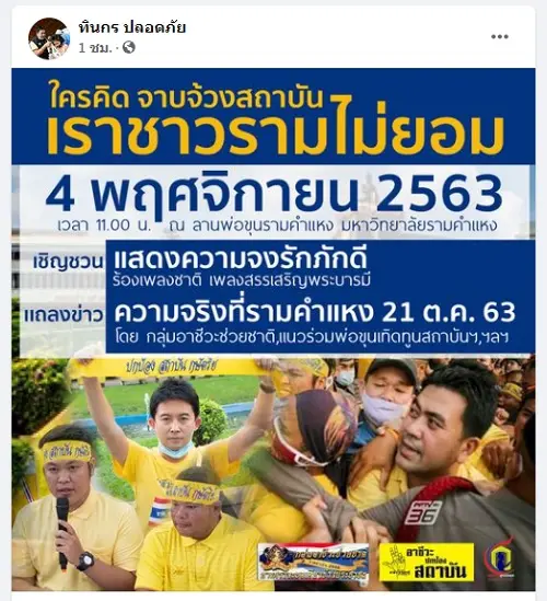 ม็อบ3พย นายทินกร ปลอดภัย แกนนำกลุ่มอาชีวะปกป้องสถาบัน โพสต์ข้อความผ่านเฟซบุ๊ก ระบุว่า วันพรุ่งนี้ (4 พ.ย.63) เวลา 11.00 น. เชิญชวนประชาชนร่วมแสดงความจงรักภักดี ร้องเพลงชาติ และเพลงสรรเสริญพระบารมี พร้อมแถลงข่าวความจริงเหตุการณ์ที่ ม.รามคำแหง เมื่อวันที่ 21 ตุลาคม โดยกลุ่มอาชีวะช่วยชาติ แนวร่วมพ่อขุนเทิดทูนสถาบัน และอื่น ๆ ที่ลานพ่อขุนรามคำแหง ม.รามคำแหง