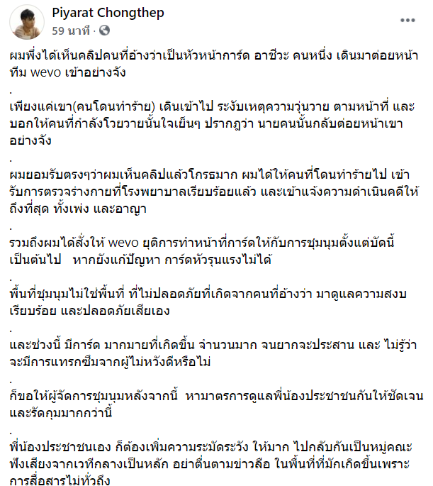 ผมยอมรับตรงๆว่าผมเห็นคลิปแล้วโกรธมาก ผมได้ให้คนที่โดนทำร้ายไป เข้ารับการตรวจร่างกายที่โรงพยาบาลเรียบร้อยแล้ว และเข้าแจ้งความดำเนินคดีให้ถึงที่สุด ทั้งเพ่ง และอาญา รวมถึงผมได้สั่งให้ wevo ยุติการทำหน้าที่การ์ดให้กับการชุมนุมตั้งแต่บัดนี้เป็นต้นไป หากยังแก้ปัญหา การ์ดหัวรุนแรงไม่ได้