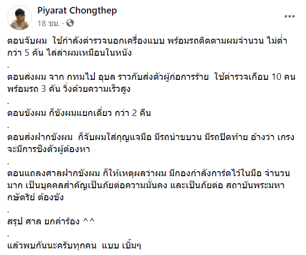 ตอนส่งผม จาก กทมไป อุบล ราวกับส่งตัวผู้ก่อการร้าย ใช้ตำรวจเกือบ 10 คน พร้อมรถ 3 คัน วิ่งด้วยความเร็วสูง ตอนขังผม ก็ขังผมแยกเดี่ยว กว่า 2 คืน ตอนส่งฝากขังผม ก็จับผมใส่กุญแจมือ มีรถนำขบวน มีรถปิดท้าย อ้างว่า เกรงจะมีการชิงตัวผู้ต้องหา ตอนแถลงศาลฝากขังผม ก็ให้เหตุผลว่าผม มีกองกำลังการ์ดไว้ในมือ จำนวนมาก เป็นบุคคลสำคัญเป็นภัยต่อความมั่นคง และเป็นภัยต่อ สถาบันพระมหากษัตริย์ ต้องขัง