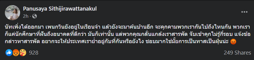 ขณะที่รุ้ง ปนัสยาได้โพสต์ข้อความผ่านทางเฟซบุ๊ก แสดงความคิดเห็นถึงเรื่องการบุกค้นและจับกุมแกนนำกลุ่มแนวร่วมธรรมศาสตร์และการชุมนุมในวันนี้ว่า