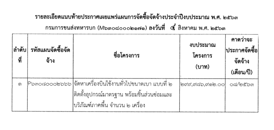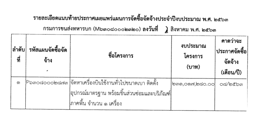 1.จัดหาเครื่องบินใช้งานทั่วไปขนาดเบา ติดตั้งอุปกรณ์มาตรฐาน พร้อมชิ้นส่วนซ่อมและบริภัณฑ์ภาคพื้น จำนวน 1 เครื่อง โครงการนี้ใช้งบประมาณ 231,017,280 บาท หรือคิดเป็นราว 7.5 ล้านเหรียญสหรัฐต่อลำ สืบราคาจากบริษัท Pilatus Aircraft คาดว่าจะเป็นการจัดหาเครื่องบิน PC-12 ทดแทน Beechcraft King Air 1900 เช่นเดิม โดยคาดว่าภารกิจคือการเป็นเครื่องบินสำหรับรับส่งบุคคลสำคัญ