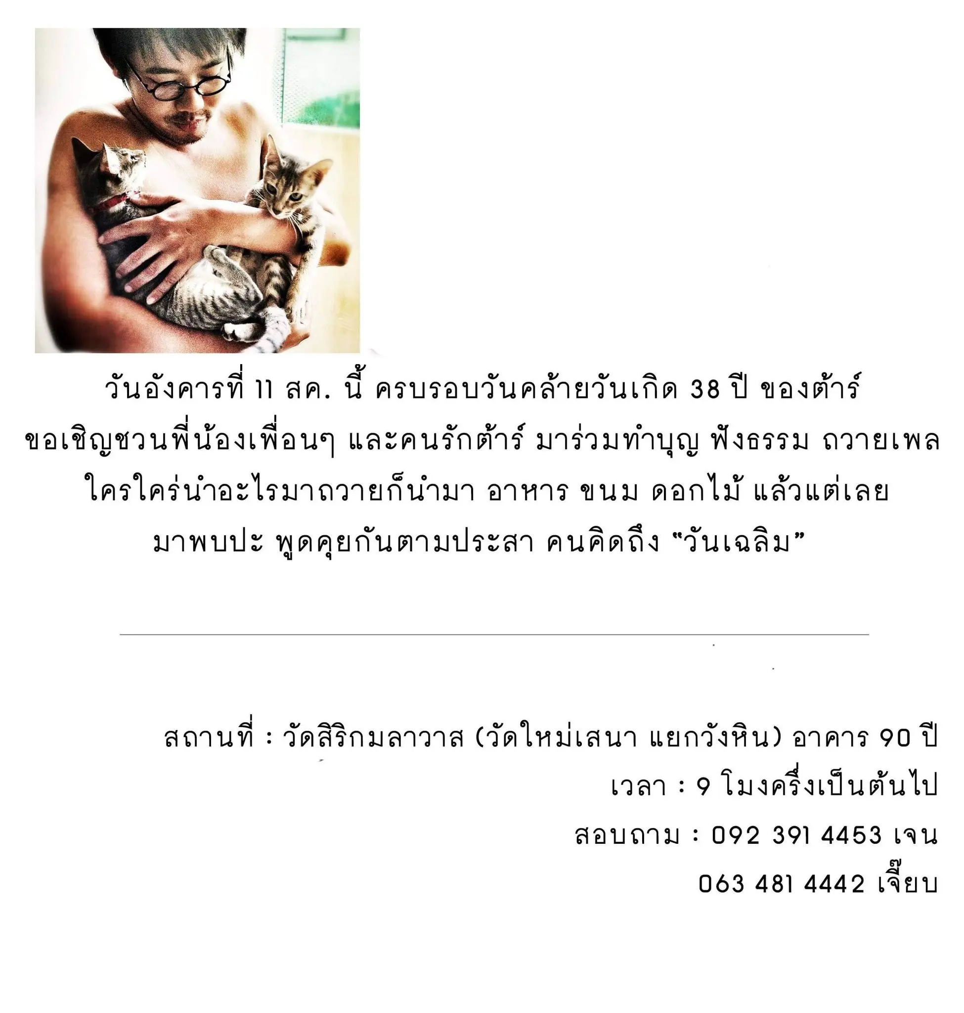ครอบครัวของนาย วันเฉลิม สัตย์ศักดิ์สิทธิ์ หรือ ต้าร์ จะจัดทำบุญครบรอบวันเกิดปีที่ 38 ให้วันเฉลิม ในวันอังคารที่ 11 สิงหาคมนี้ เวลา 09.00 น.เป็นต้นไป ที่วัดสิริกมลาวาส (วัดใหม่เสนา แยกวังหิน) อาคาร 90 ปี พร้อมทั้งเชิญชวนพี่น้อง และคนที่ร่วมให้กำลังใจวันเฉลิมและครอบครัวมาโดยตลอดร่วมทำบุญ ฟังธรรม และถวายเพลด้วย