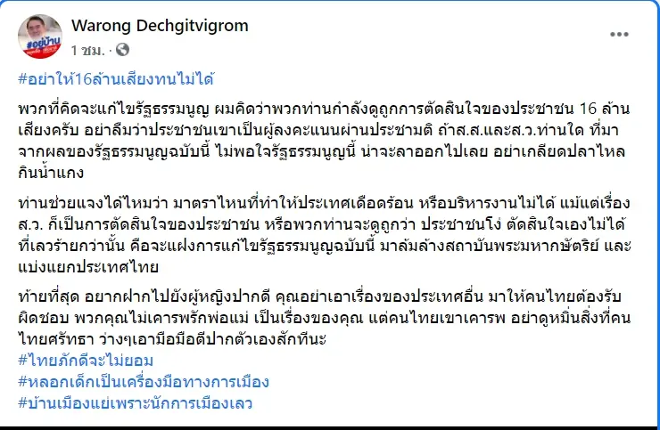พวกที่คิดจะแก้ไขรัฐธรรมนูญ ผมคิดว่าพวกท่านกำลังดูถูกการตัดสินใจของประชาชน 16 ล้านเสียงครับ อย่าลืมว่าประชาชนเขาเป็นผู้ลงคะแนนผ่านประชามติ ถ้าส.ส.และส.ว.ท่านใด ที่มาจากผลของรัฐธรรมนูญฉบับนี้ ไม่พอใจรัฐธรรมนูญนี้ น่าจะลาออกไปเลย อย่าเกลียดปลาไหลกินน้ำแกง